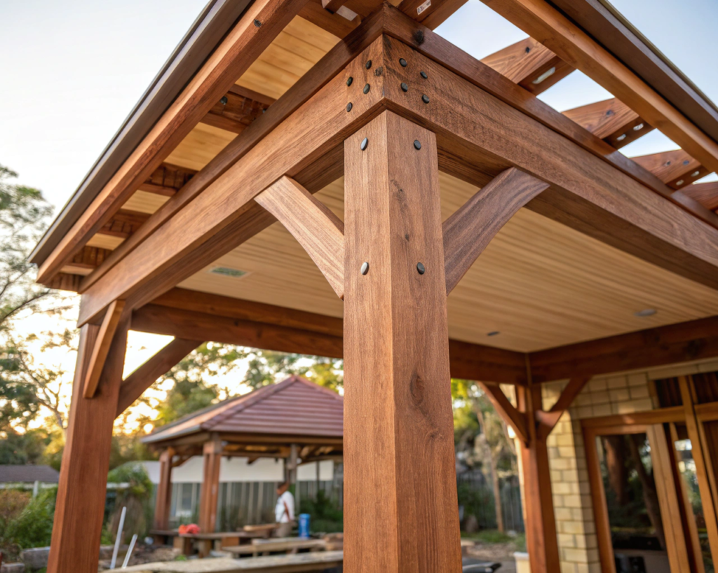 Timber brings something to a gazebo that steel and aluminium simply can’t replicate — soul. There’s a natural warmth to it, a texture and a grain that makes the structure feel genuinely connected to the garden around it rather than sitting on top of it. Run your hand along a Merbau post that’s been properly finished and you’ll feel the difference immediately.